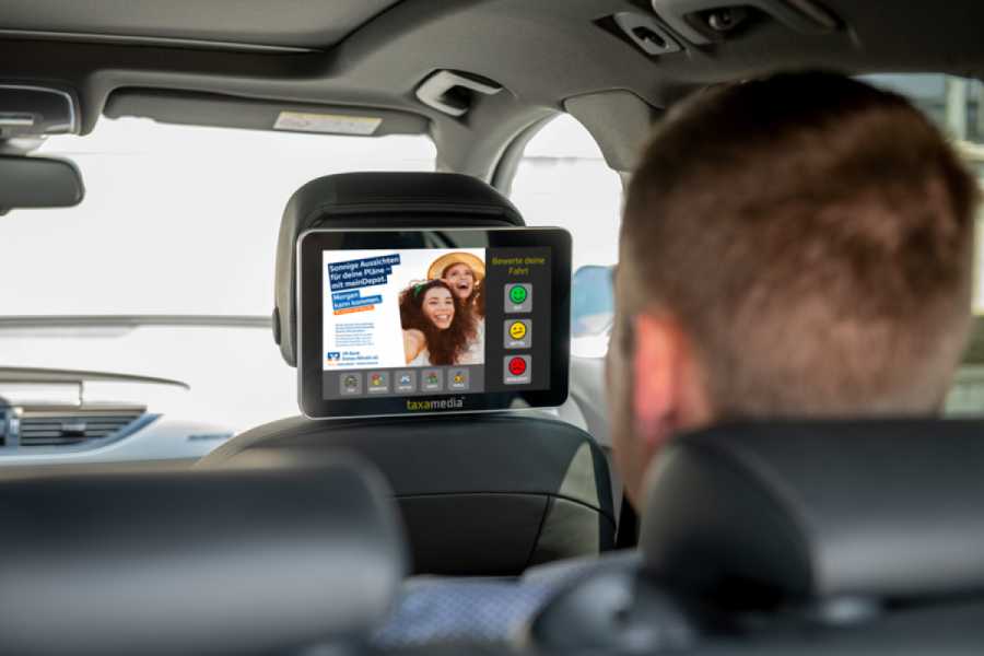 Auf einem Bildschirm im Taxi – direkt im Blickfeld der Fahrgäste.